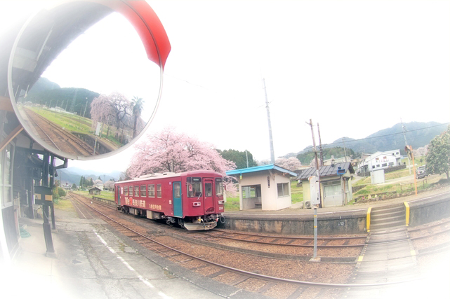 - 加茂野駅の桜を撮影していたところ、偶然出会った「ながら」。青空と桜の花、「ながら」のえんじ色、春の暖かさを感じました。