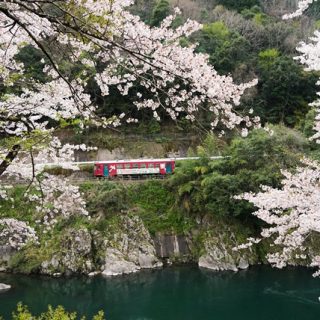- 長良川沿いの桜満開の中を越美南線全線開通80周年記念号が通過した。